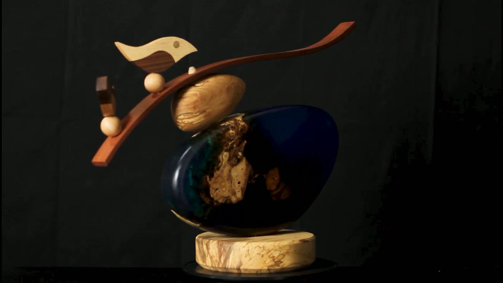Main body is Laburnum wood with blue resin and a solid Walnut secondary pebble, sitting on a Hornbeam base. The birds are a mix of contrasting Maple and Walnut or Walnut and Oak with Spele bent lamination branch.